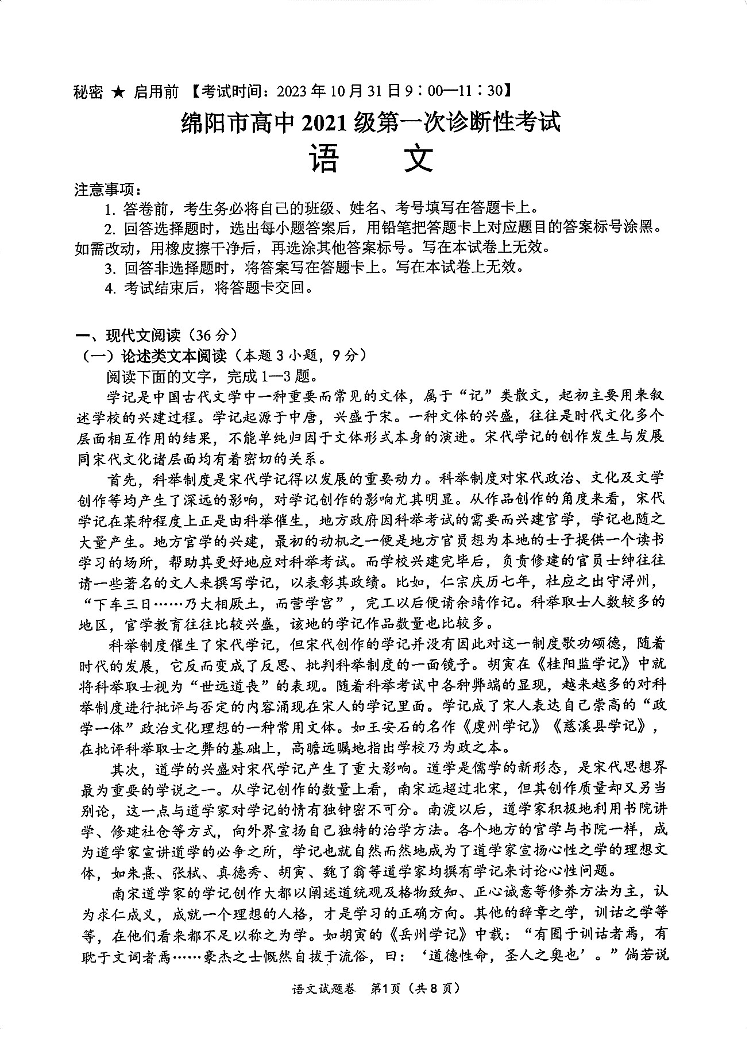 四川省绵阳市2024届高三上学期第一次诊断性考试语文