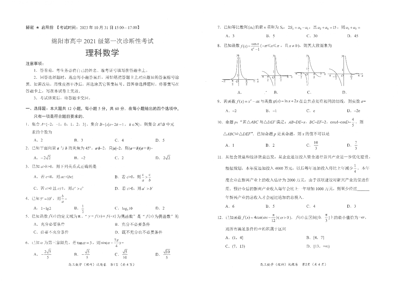 四川省绵阳市2024届高三上学期第一次诊断性考试理科数学