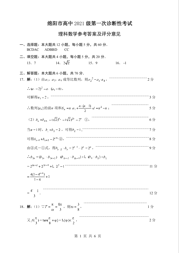 四川省绵阳市2024届高三上学期第一次诊断性考试理科数学答案