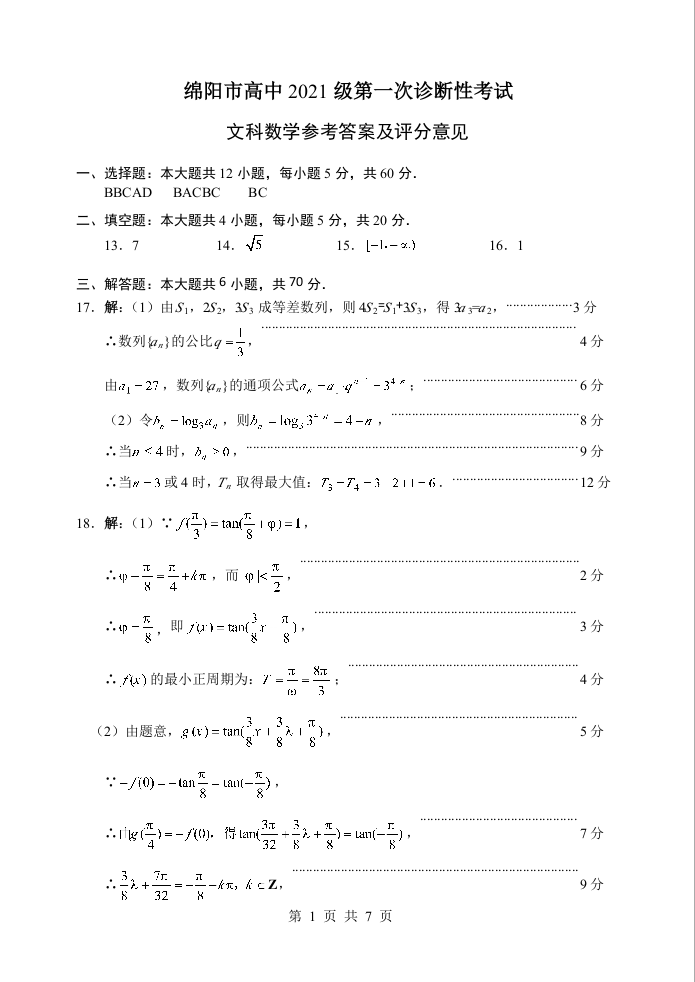 四川省绵阳市2024届高三上学期第一次诊断性考试文科数学答案