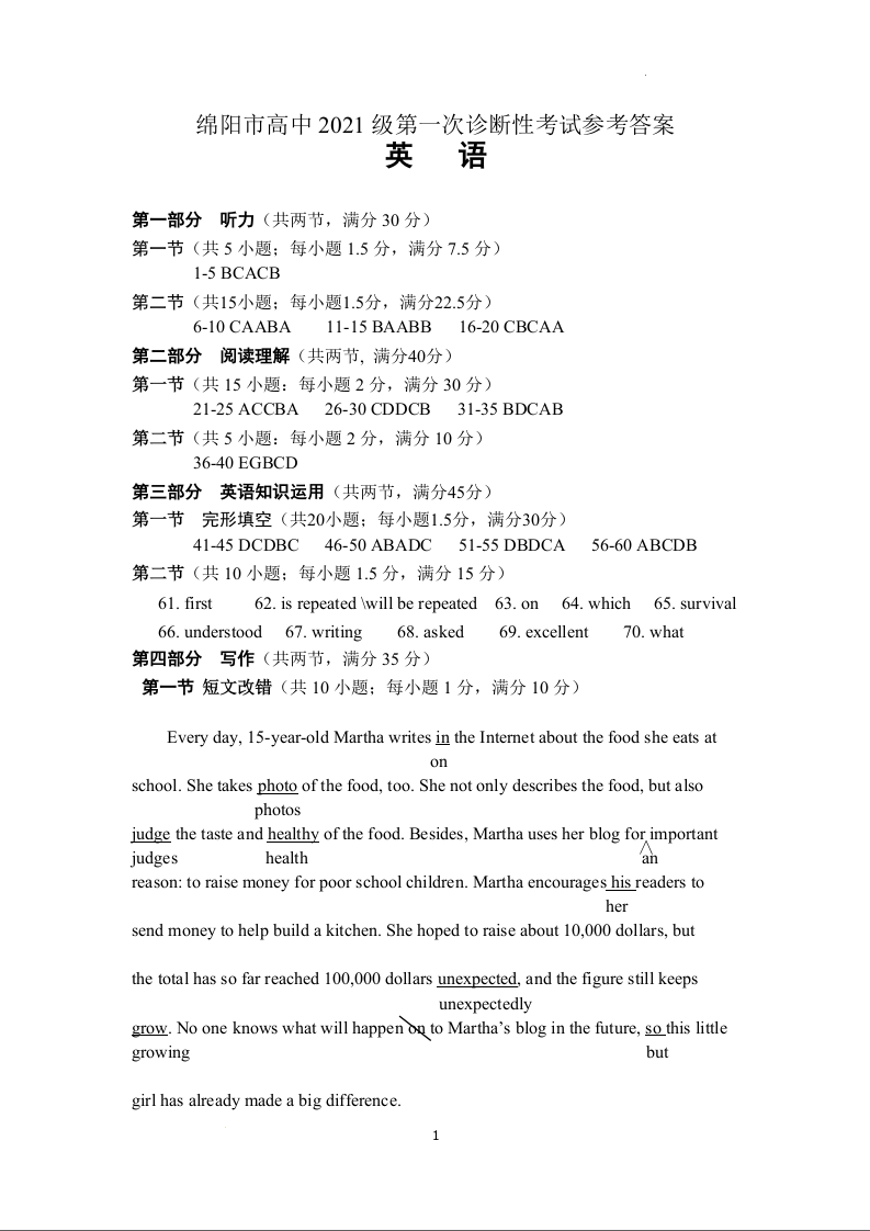 四川省绵阳市2024届高三上学期第一次诊断性考试英语答案