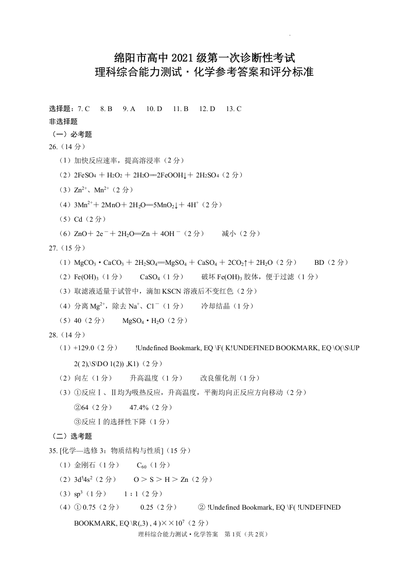 四川省绵阳市2024届高三上学期第一次诊断性考试化学答案