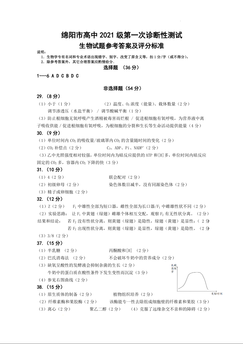 四川省绵阳市2024届高三上学期第一次诊断性考试生物答案
