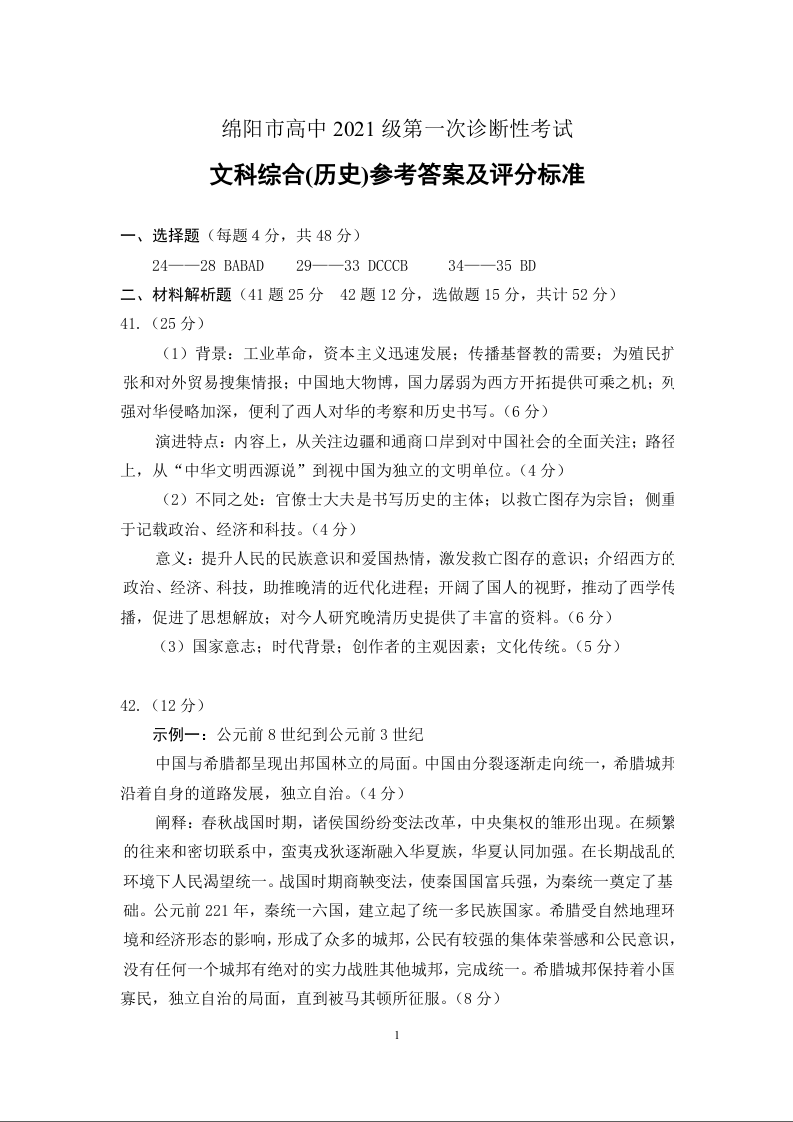 四川省绵阳市2024届高三上学期第一次诊断性考试历史答案