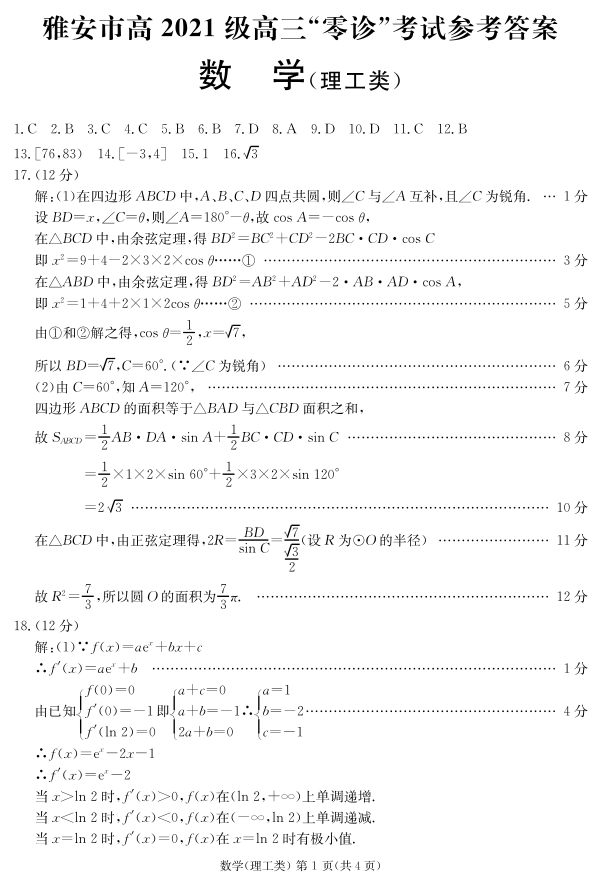四川省雅安市高2024届高三零诊考试理科数学答案