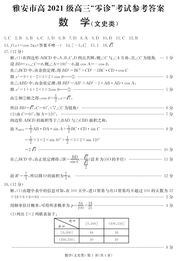 四川省雅安市高2024届高三零诊考试文科数学答案
