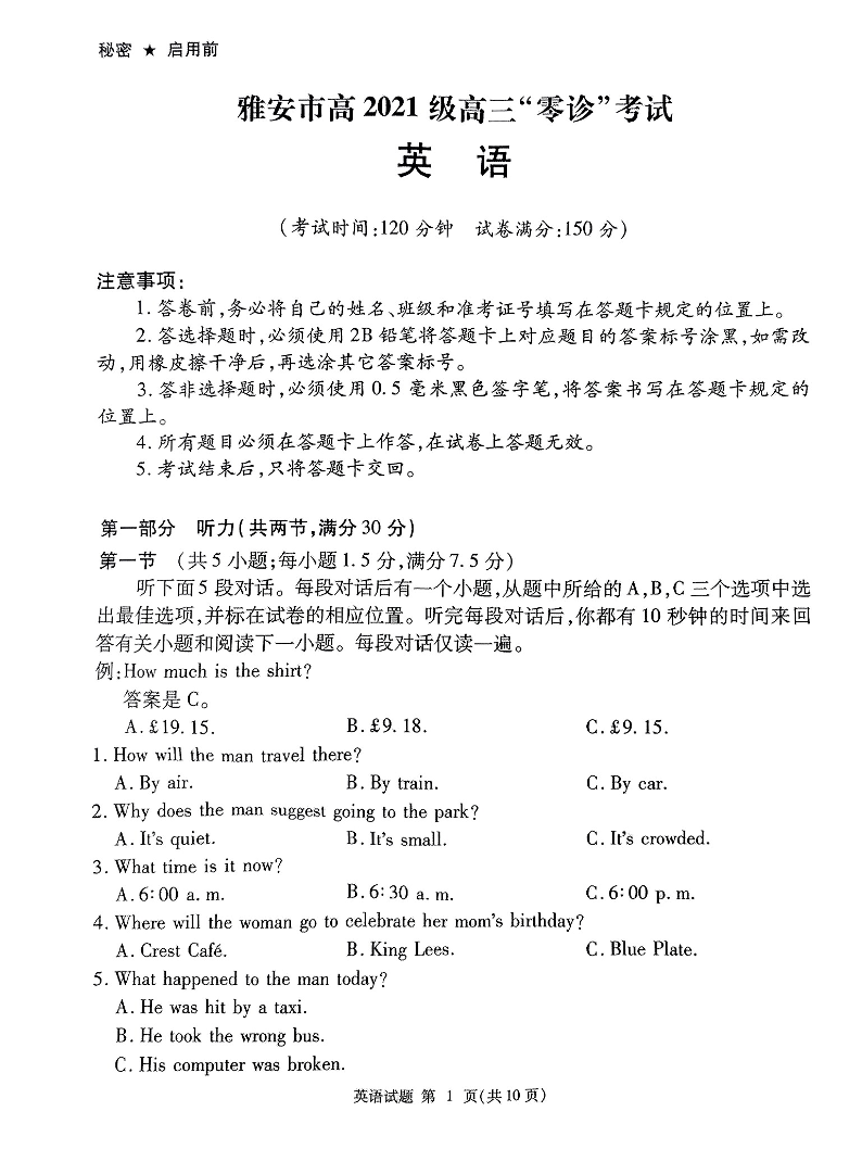四川省雅安市高2024届高三零诊考试英语