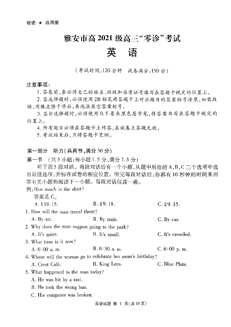 四川省雅安市高2024届高三零诊考试英语答案
