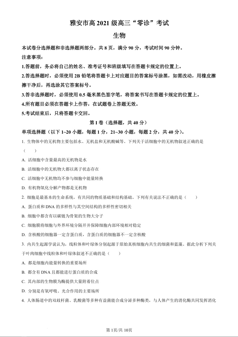 四川省雅安市高2024届高三零诊考试生物(原卷版)