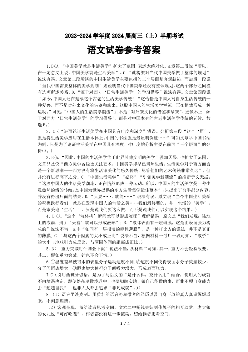 四川省成都市第七中学2024届高三上学期期中考试语文答案