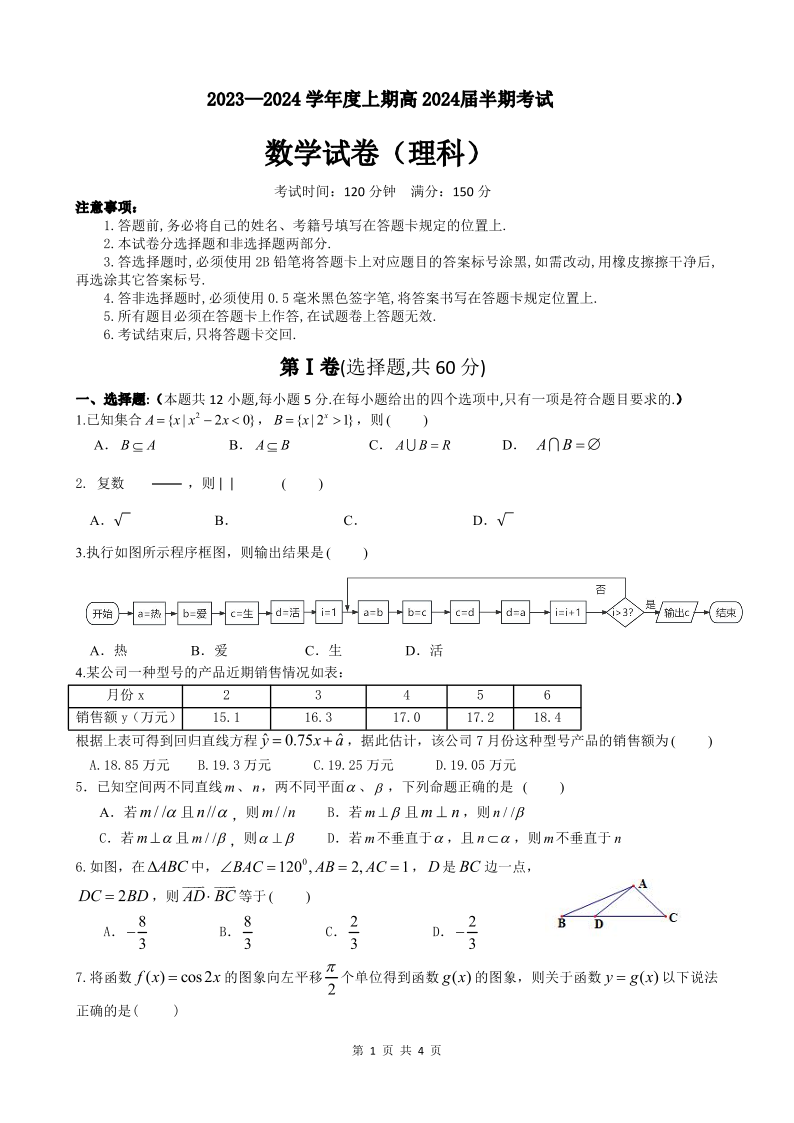 四川省成都市第七中学2024届高三上学期期中考试理科数学