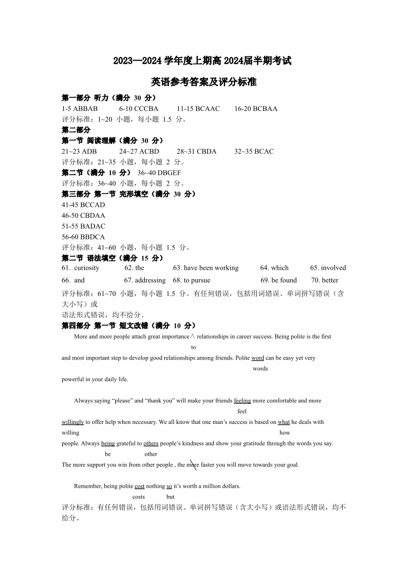 四川省成都市第七中学2024届高三上学期期中考试英语答案