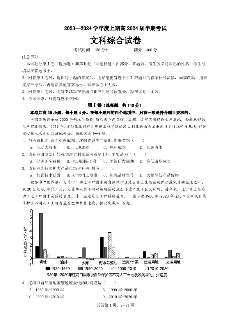 四川省成都市第七中学2024届高三上学期期中考试文综+答案