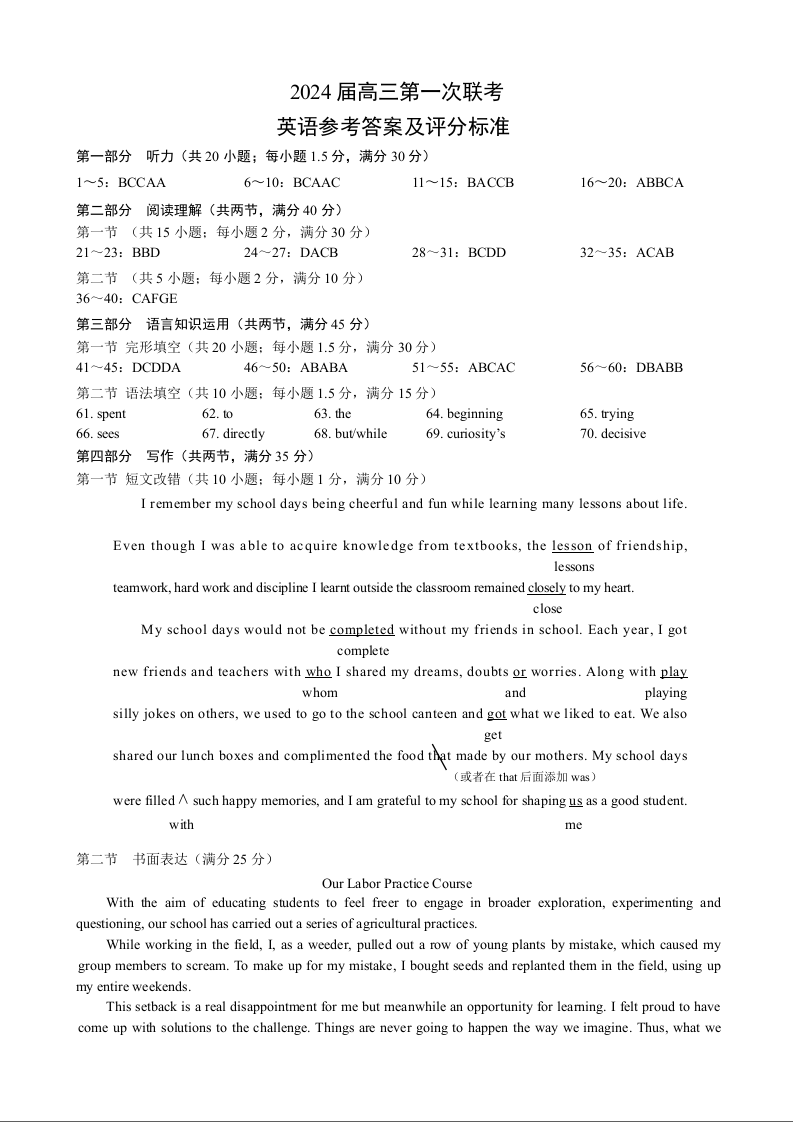 四川省2024届容城名校联盟高三第一次联考英语答案