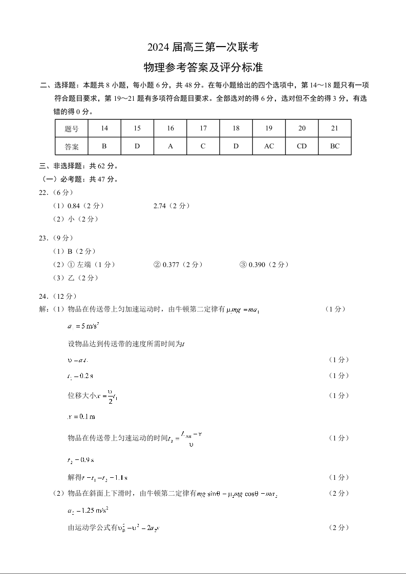 四川省2024届容城名校联盟高三第一次联考物理答案