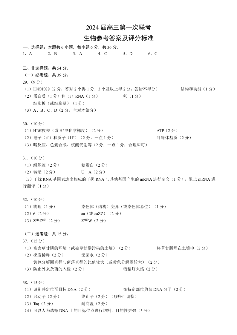 四川省2024届容城名校联盟高三第一次联考生物答案