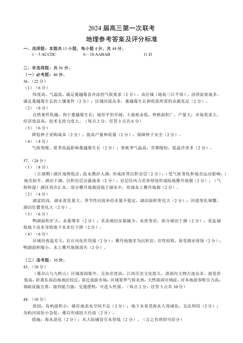四川省2024届容城名校联盟高三第一次联考地理答案