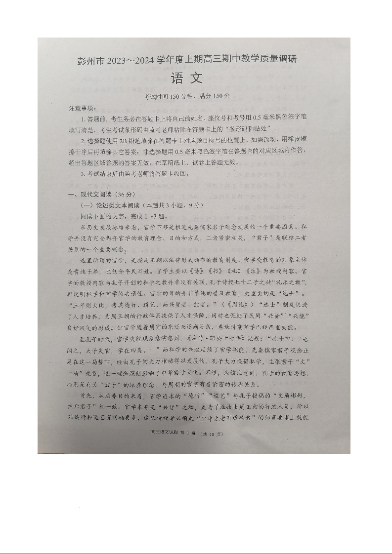 四川省成都市彭州市2024届度上期高三期中教学质量调研语文