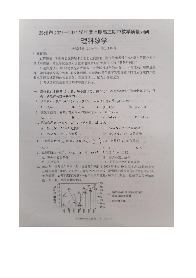 四川省成都市彭州市2024届度上期高三期中教学质量调研理科数学