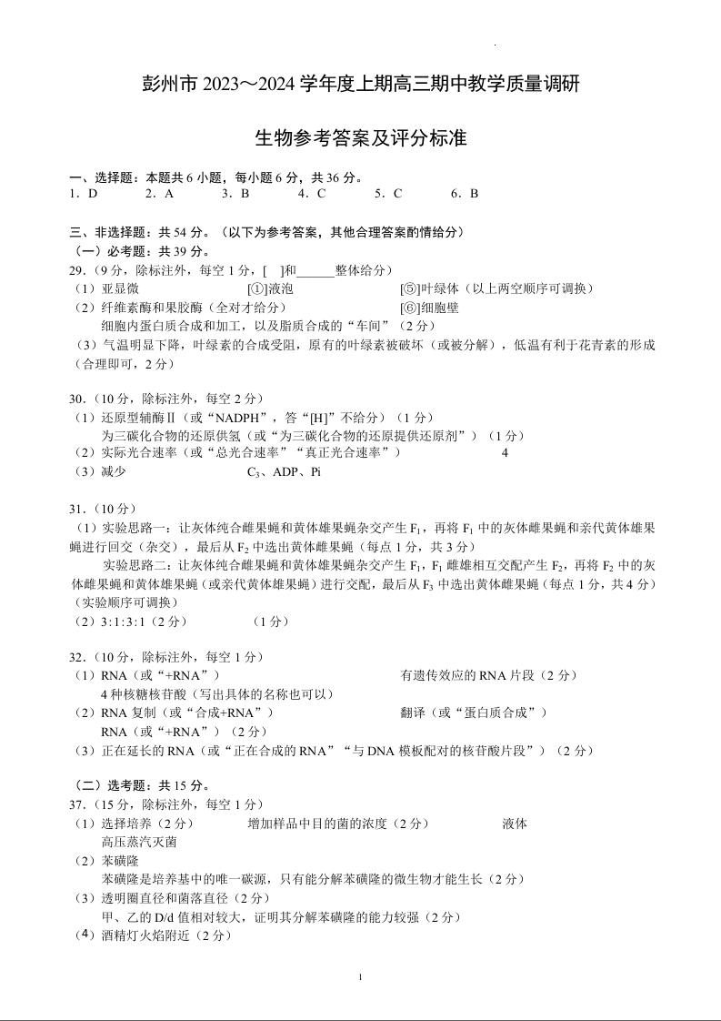 四川省成都市彭州市2024届度上期高三期中教学质量调研理综生物答案