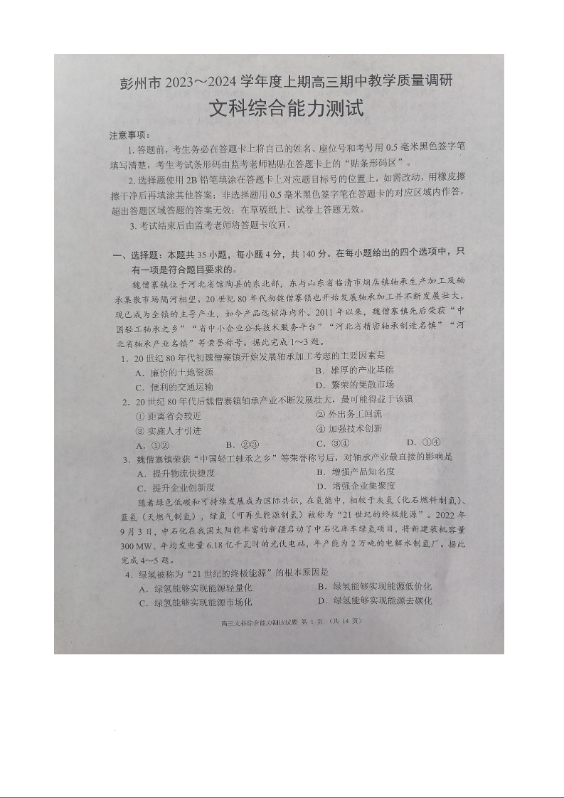 四川省成都市彭州市2024届度上期高三期中教学质量调研文综