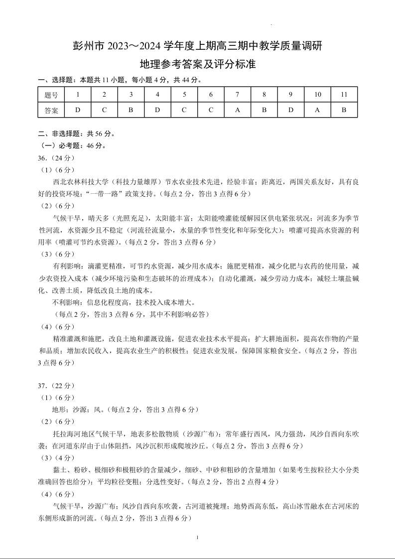 四川省成都市彭州市2024届度上期高三期中教学质量调研文综地理答案