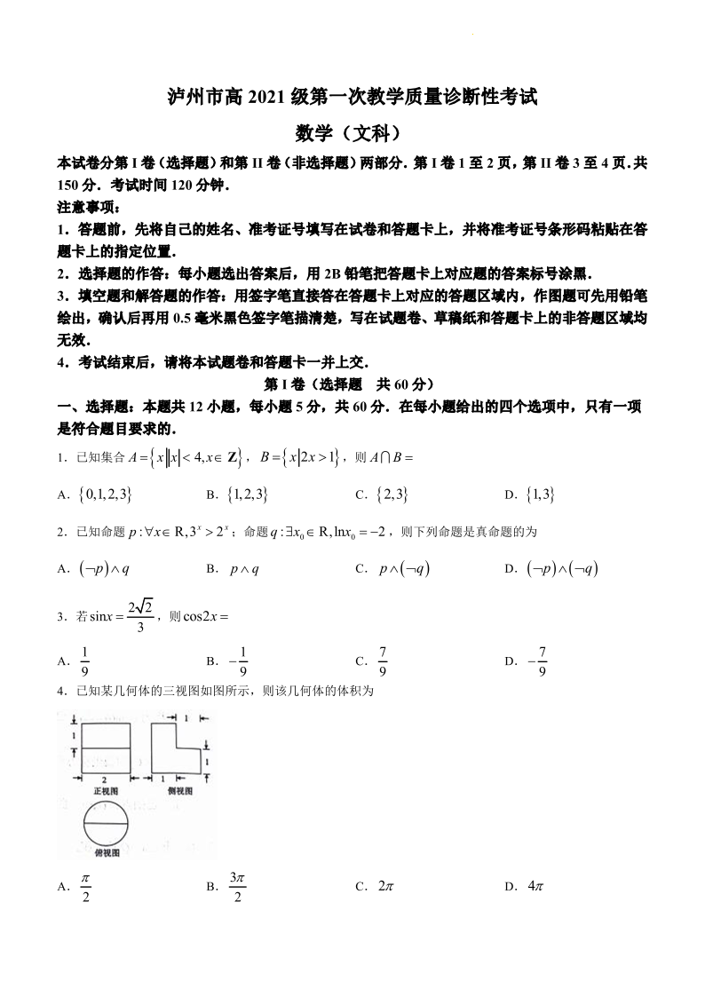 四川省泸州市高2024届第一次教学质量诊断性考试文科数学
