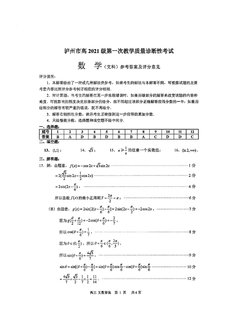 四川省泸州市高2024届第一次教学质量诊断性考试文科数学答案
