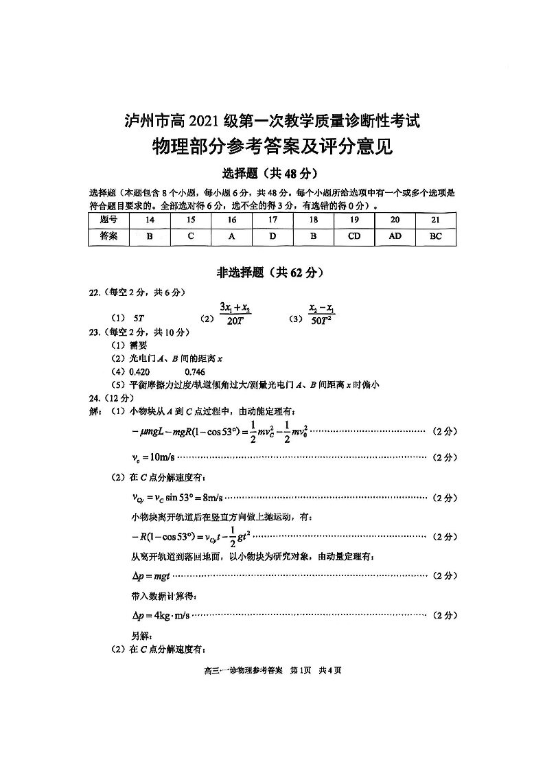 四川省泸州市高2024届第一次教学质量诊断性考试理综物理答案