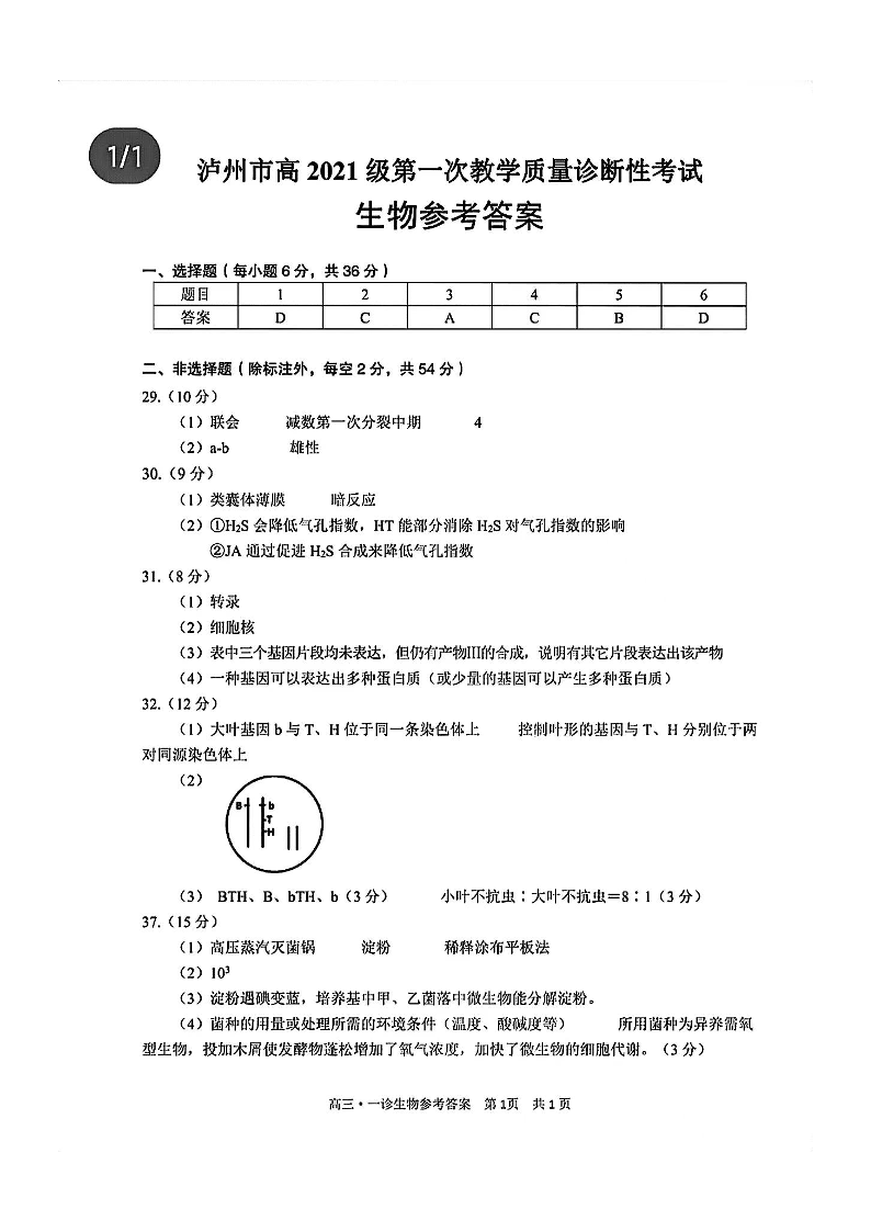 四川省泸州市高2024届第一次教学质量诊断性考试理综生物答案