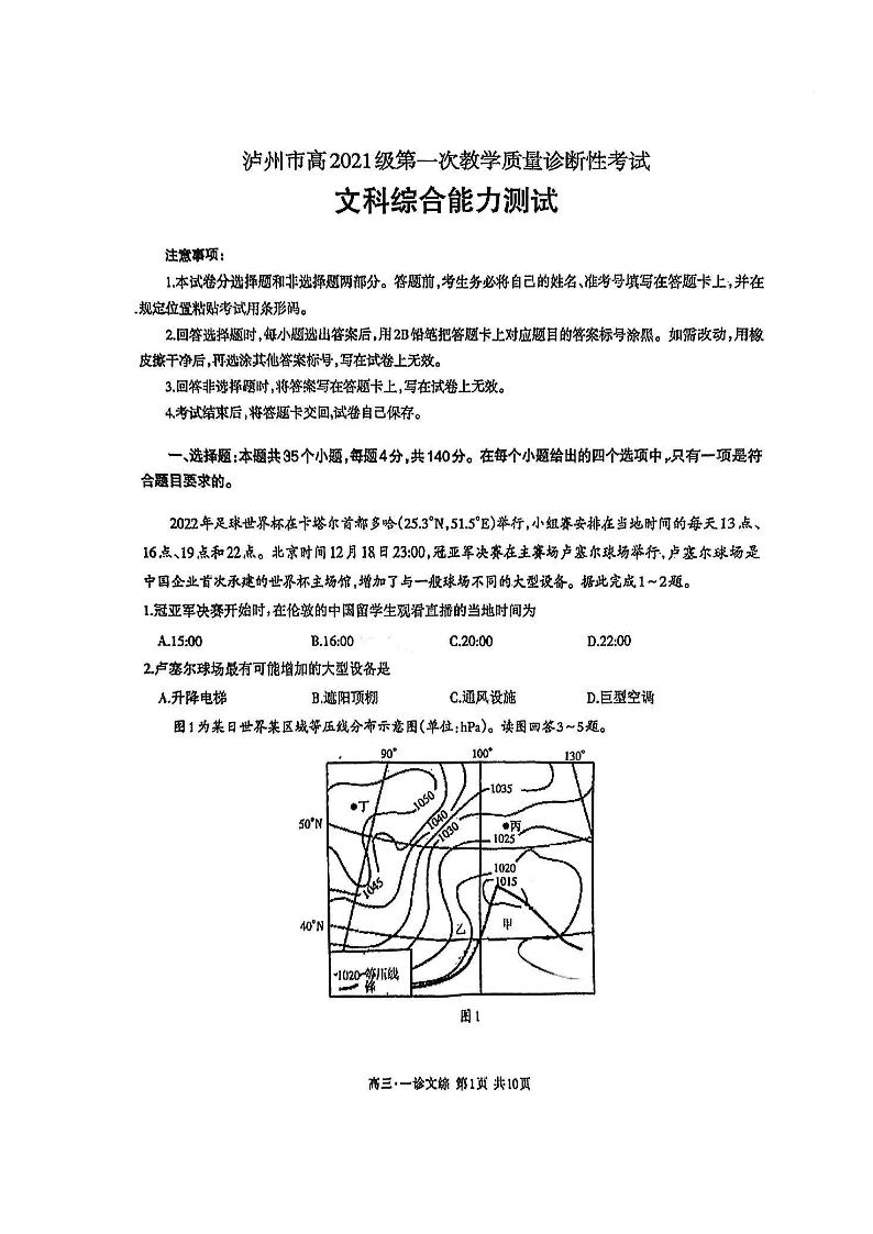 四川省泸州市高2024届第一次教学质量诊断性考试文综