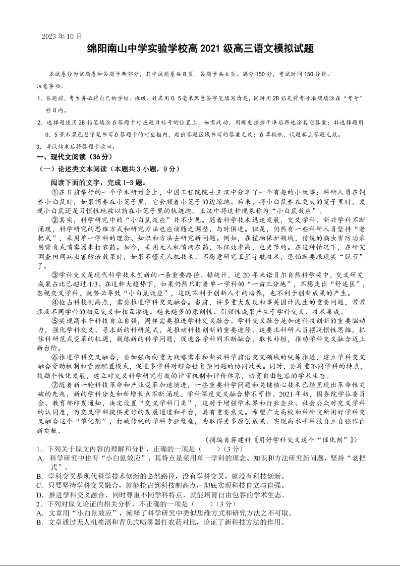 四川省绵阳市南山中学实验学校2024届高三上学期10月月考语文+答案
