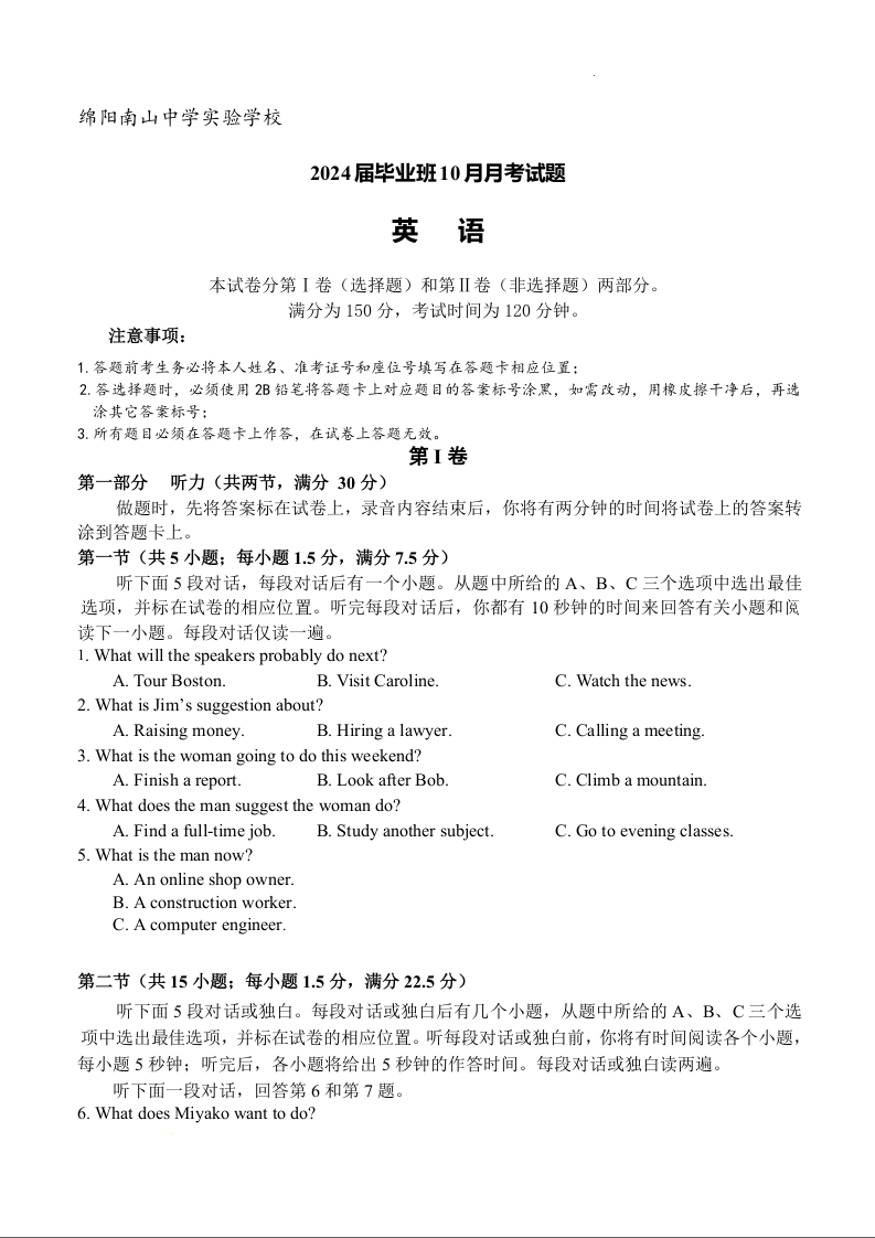 四川省绵阳市南山中学实验学校2024届高三上学期10月月考英语+答案