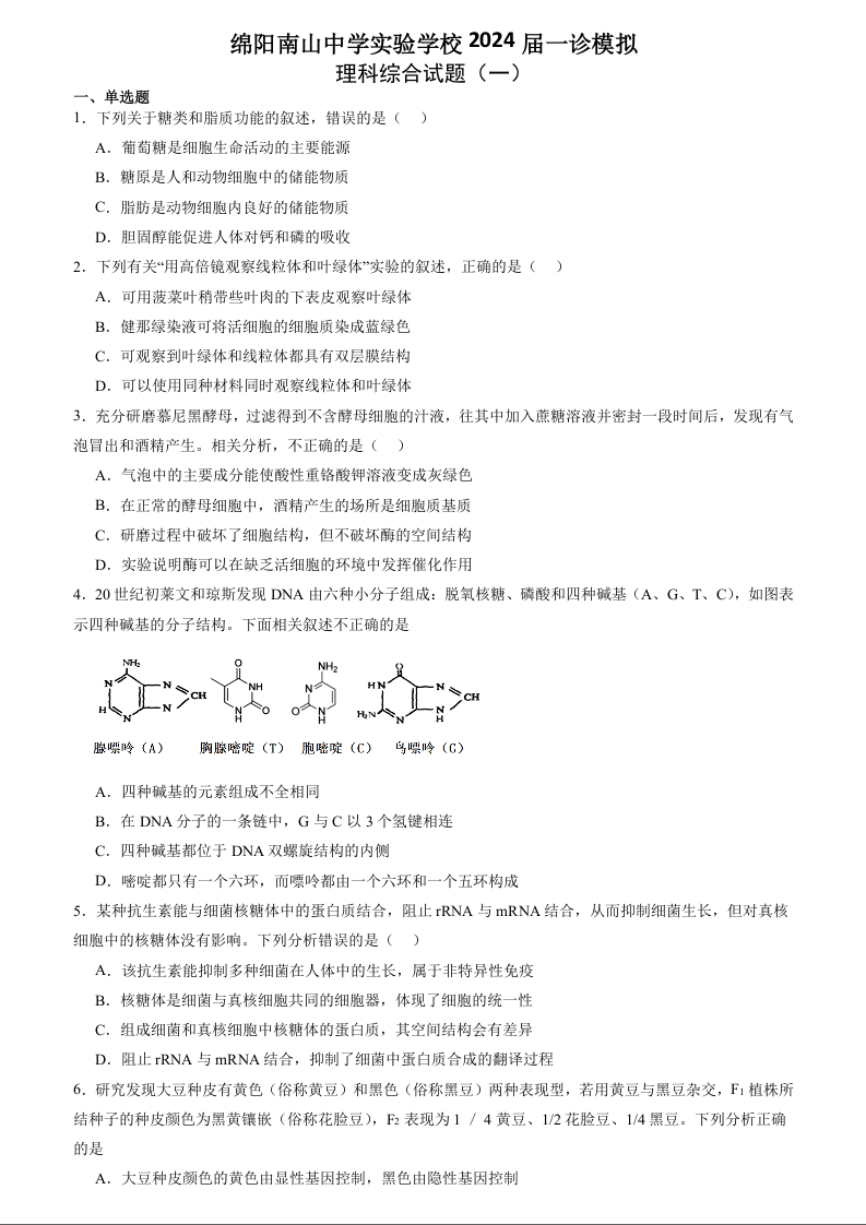 四川省绵阳市南山中学实验学校2024届高三上学期10月月考理综+答案