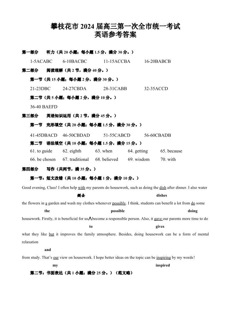 四川省攀枝花市2024届高三第一次统一考试英语答案