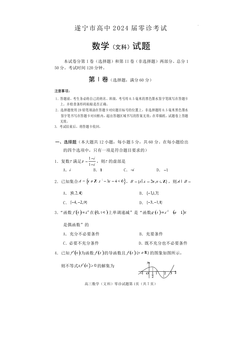 四川省遂宁市2024届高三上学期零诊考试文科数学