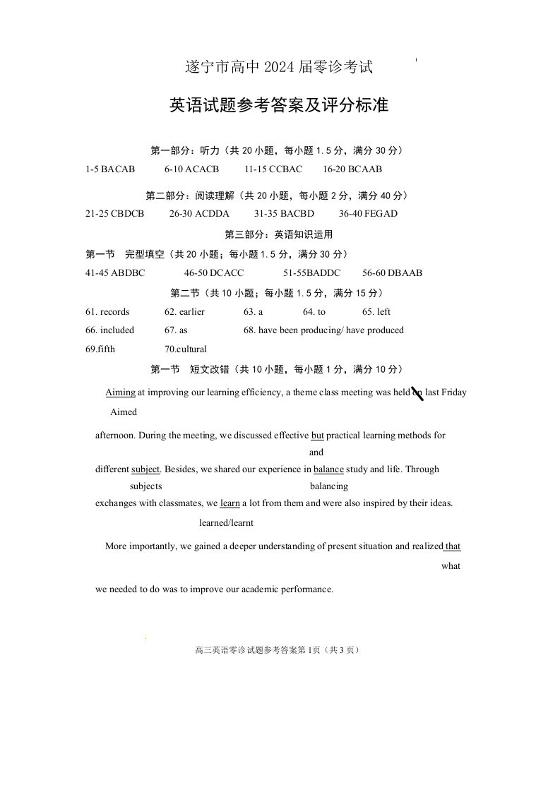 四川省遂宁市2024届高三上学期零诊考试英语答案