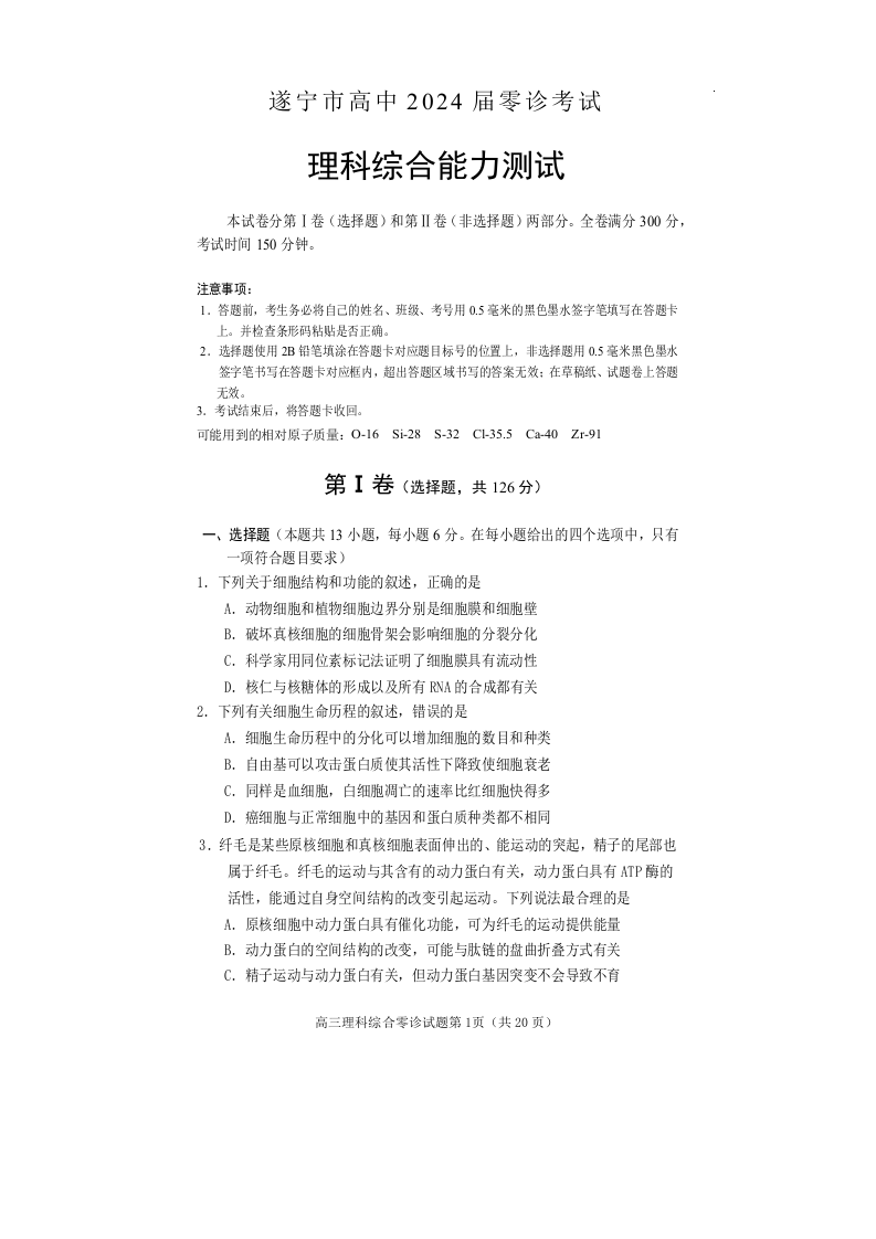四川省遂宁市2024届高三上学期零诊考试理综