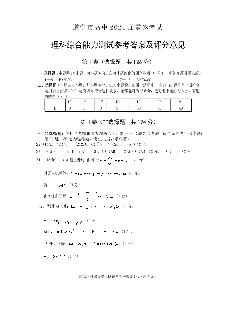 四川省遂宁市2024届高三上学期零诊考试理综答案