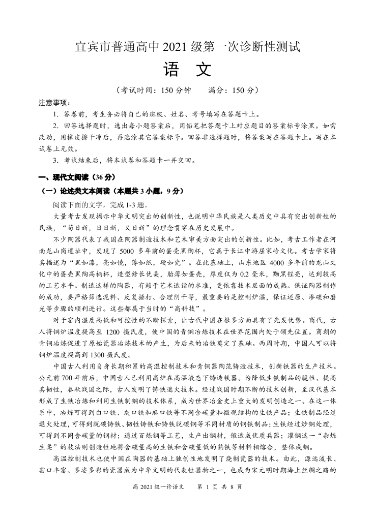 四川省宜宾市2024届高三上学期第一次诊断性测试语文