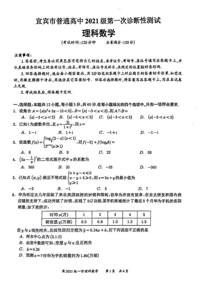 四川省宜宾市2024届高三上学期第一次诊断性测试理科数学
