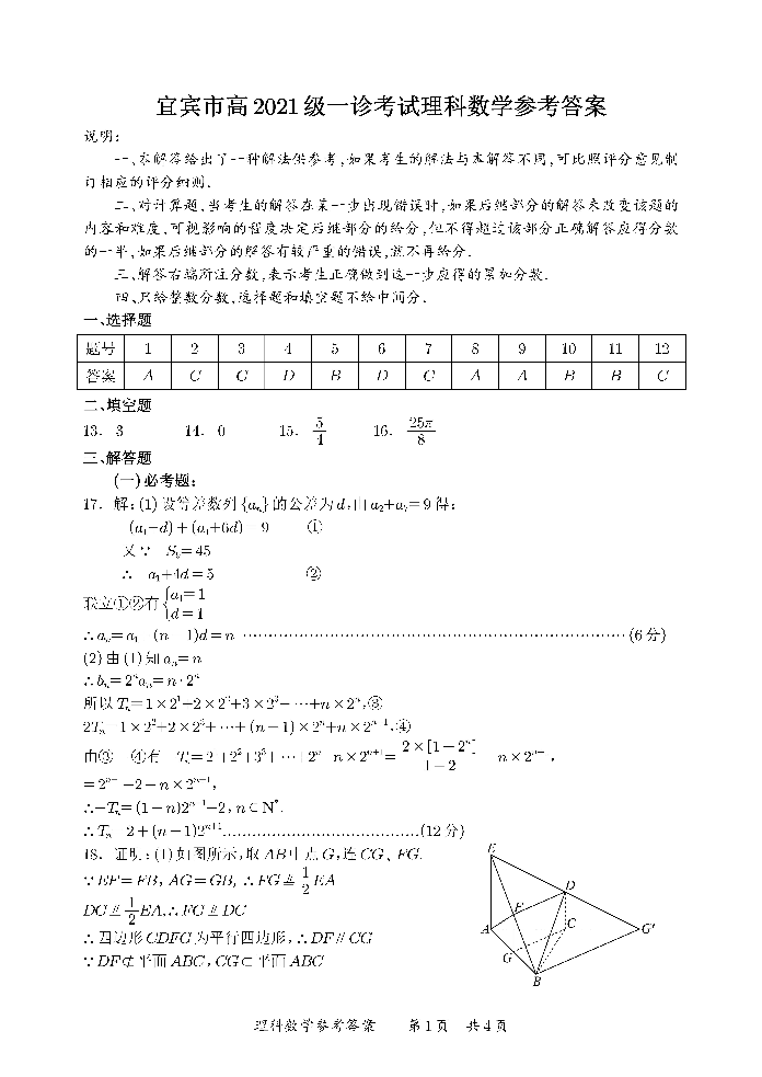 四川省宜宾市2024届高三上学期第一次诊断性测试理科数学答案