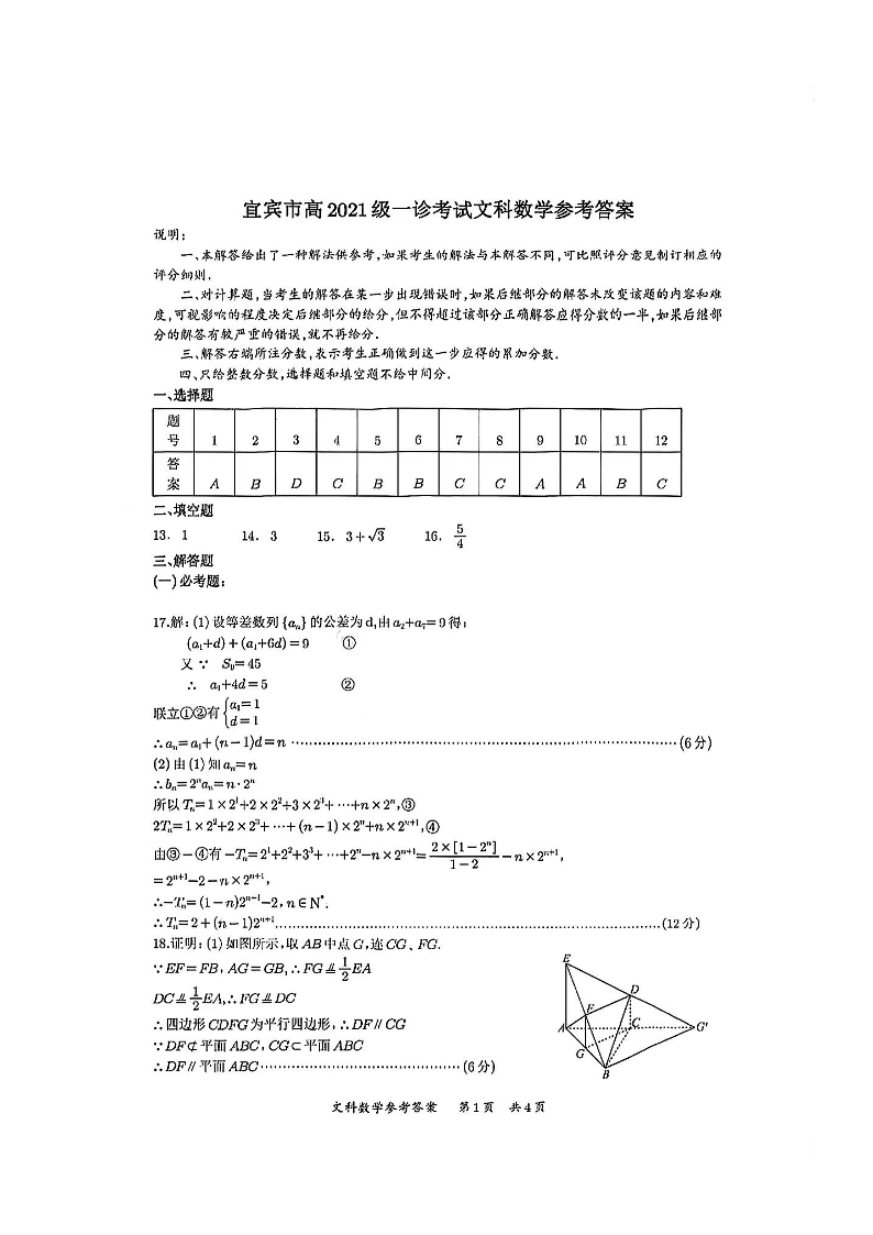 四川省宜宾市2024届高三上学期第一次诊断性测试文科数学答案