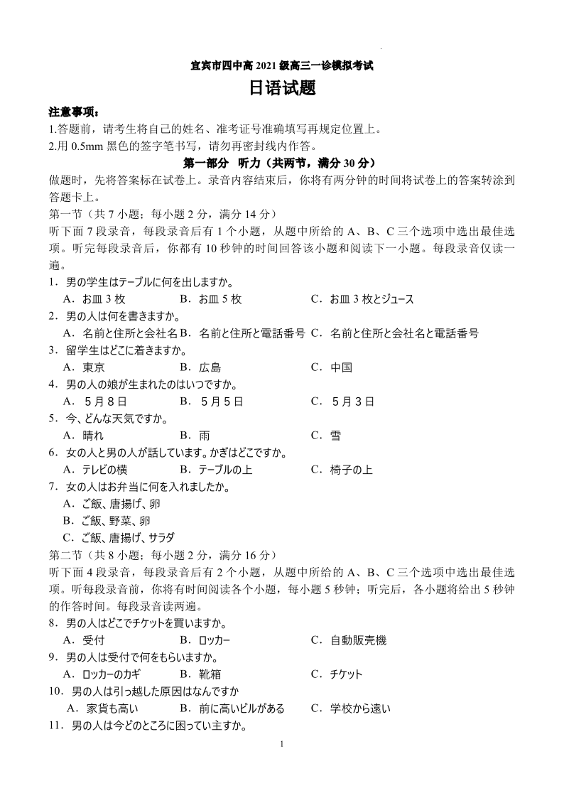 四川省宜宾市2024届高三上学期第一次诊断性测试日语