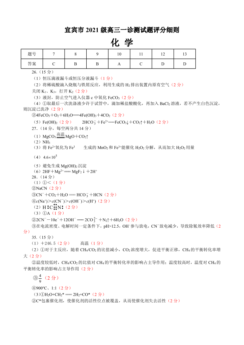 四川省宜宾市2024届高三上学期第一次诊断性测试理综化学答案