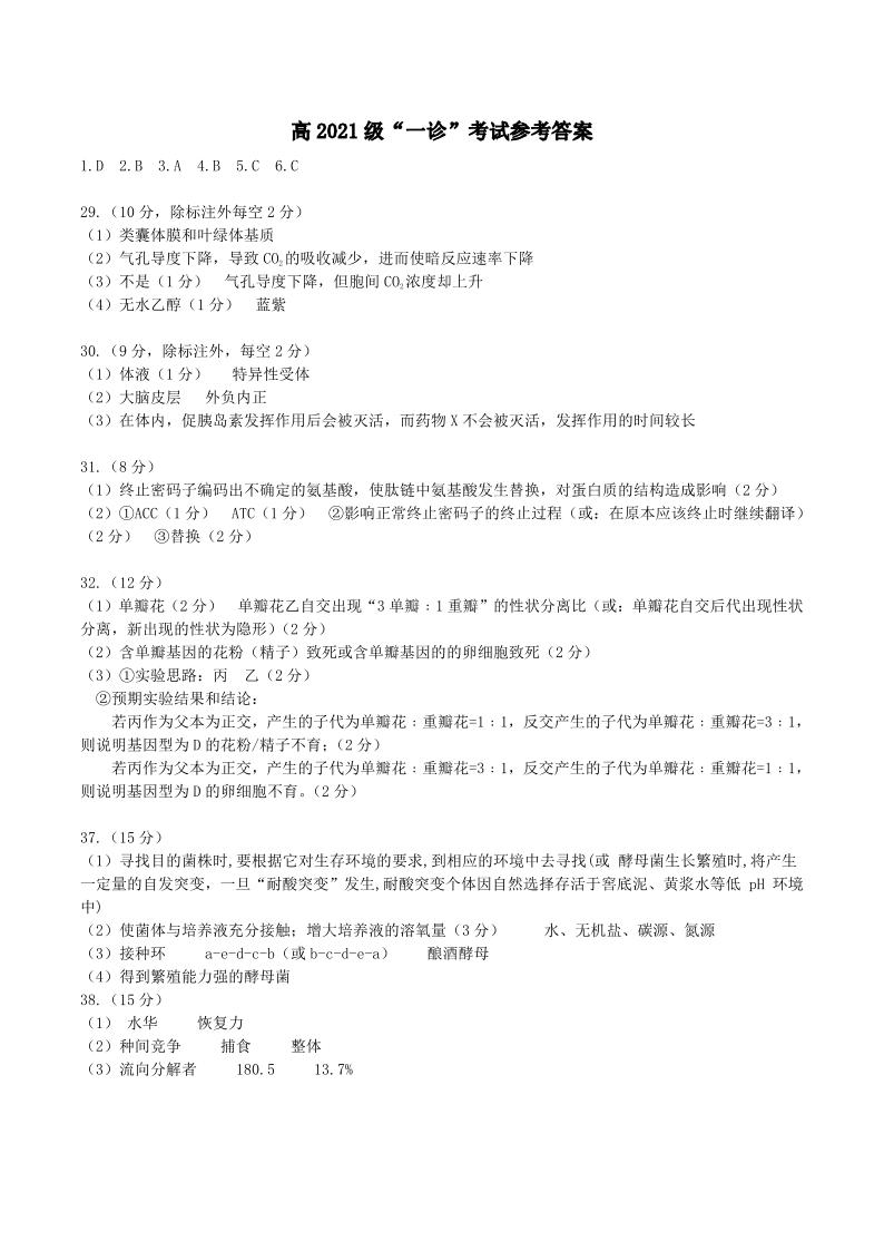 四川省宜宾市2024届高三上学期第一次诊断性测试理综生物答案