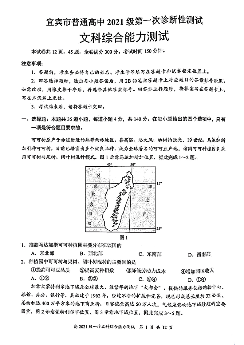四川省宜宾市2024届高三上学期第一次诊断性测试文综