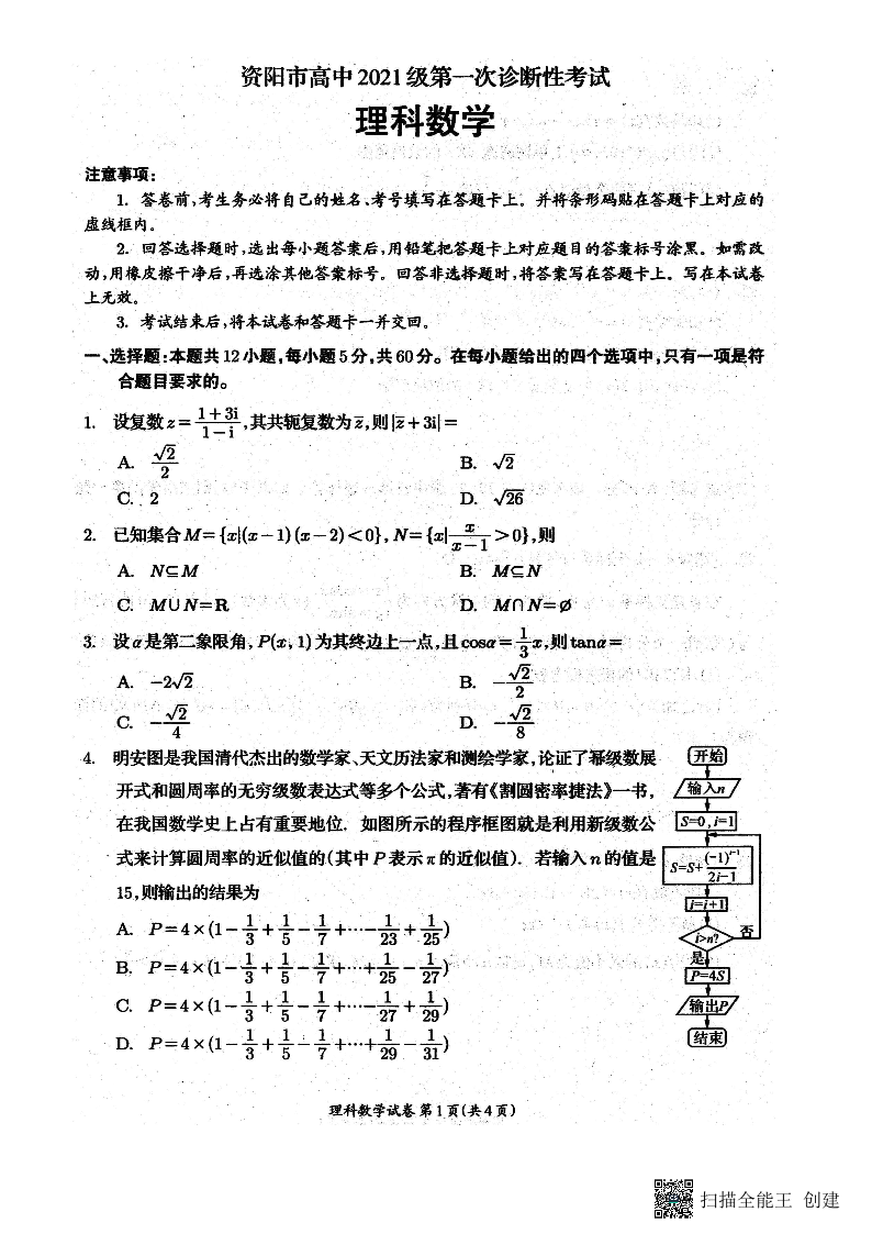 四川省资阳市2024届高三上学期第一次诊断性考试理科数学+答案