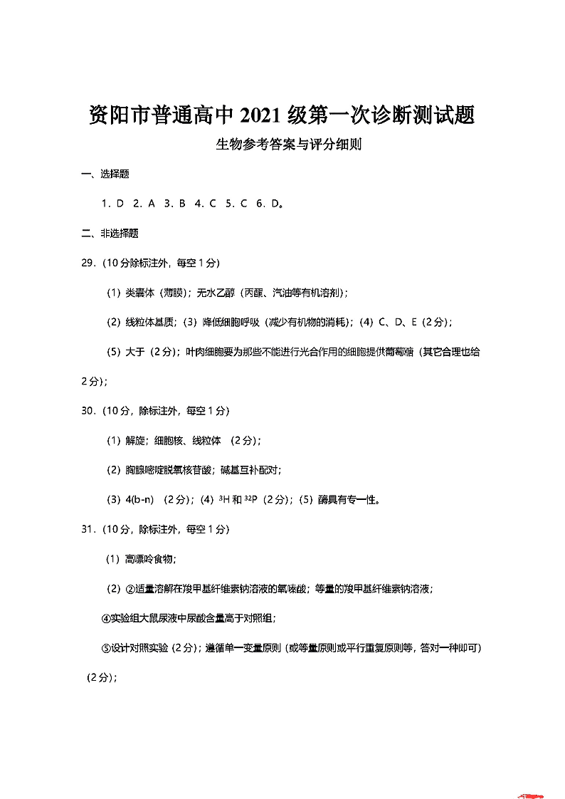 四川省资阳市2024届高三上学期第一次诊断性考试理综答案