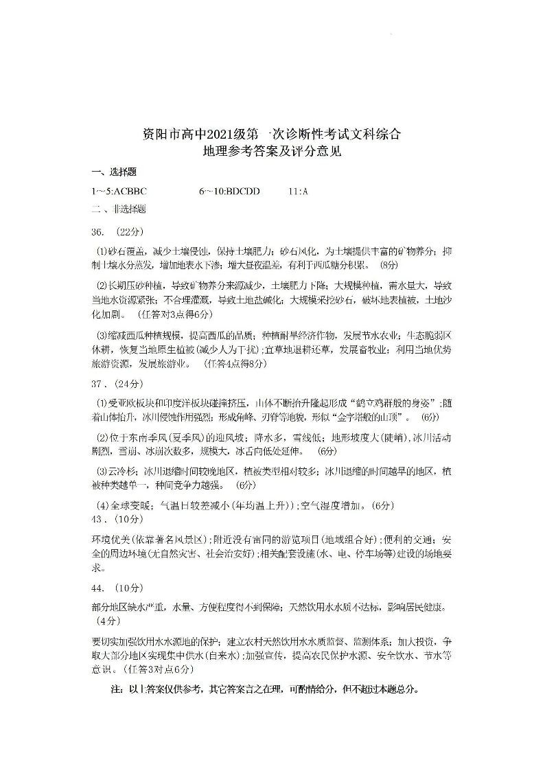 四川省资阳市2024届高三上学期第一次诊断性考试文综答案